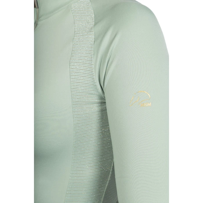 A breathable base layer is crafted with elastic properties for the perfect fit. Featuring a 1/4 zip and a glittery panel around the arms, this base layer is sure to add a touch of elegance to your equestrian training wardrobe.