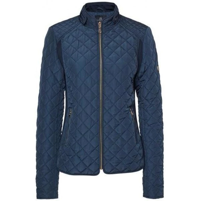 Elegant quilted ladies jacket with rib fabric inserts at sides for a close fit. Gold colored trims and details
