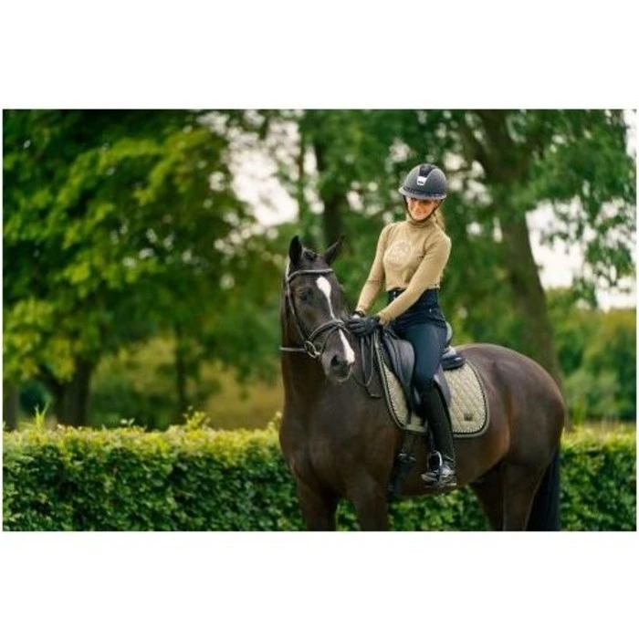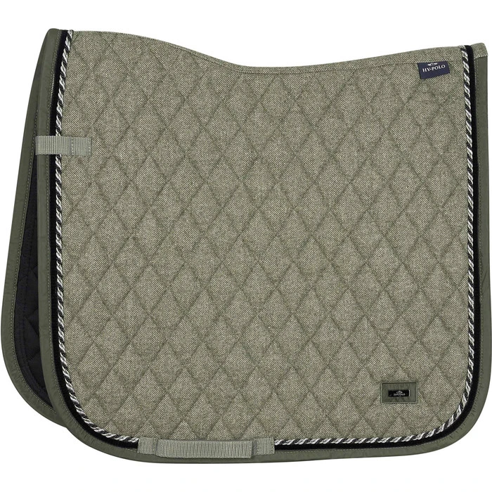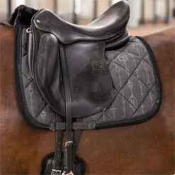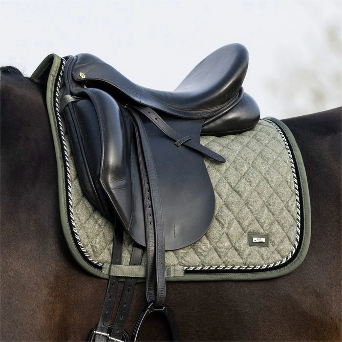 Saddlepad made out of wool material with a binding of fake memory. With small diamond quilting, a velvet tape and a fancy twisted rope along the binding. With a luxury embroidery at the backline and small metal plate with brand logo at the corner.